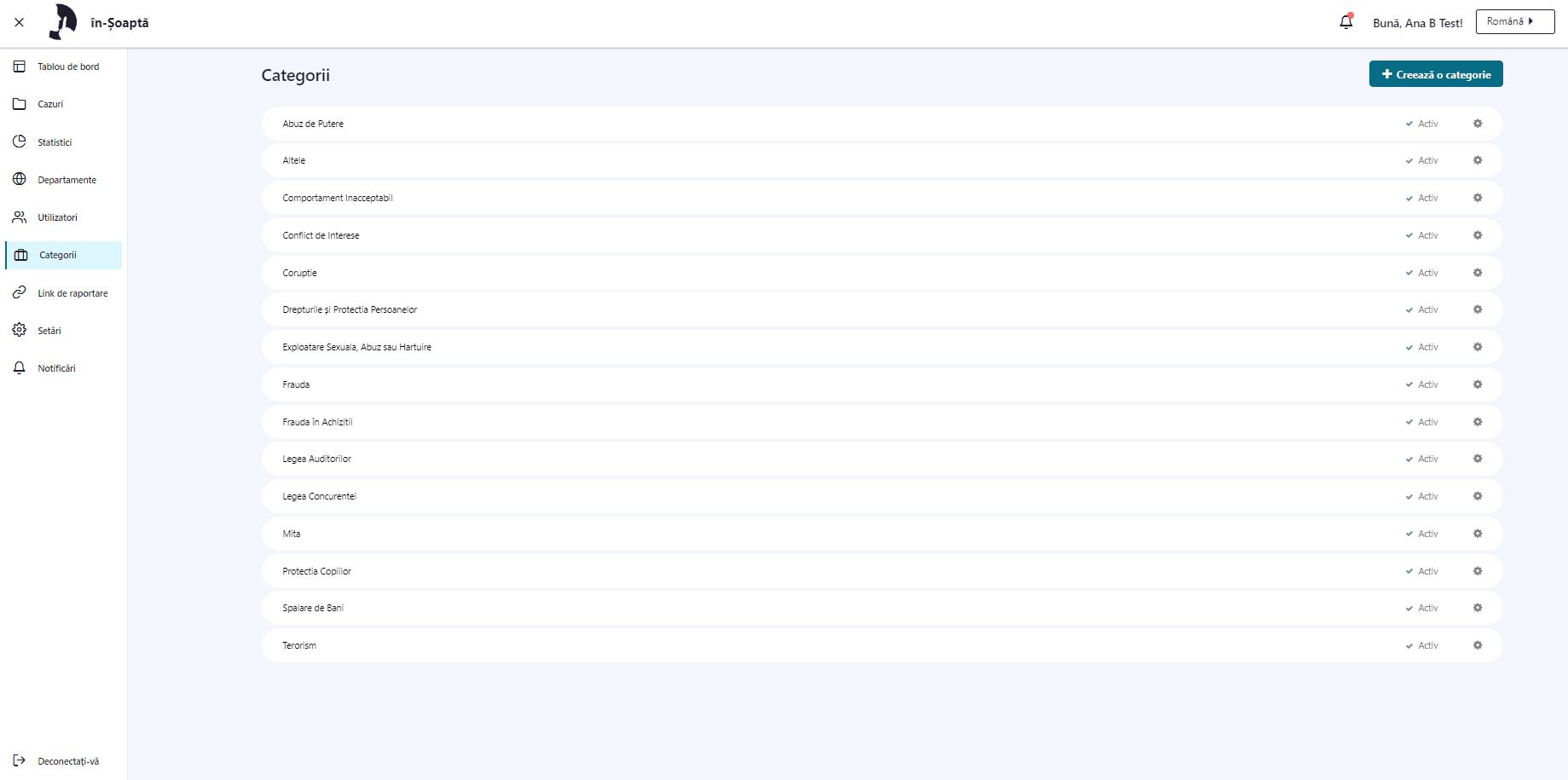 Aplicația „în Șoaptă” oferă 15 categorii implicite care pot fi eliminate temporar din lista activă și, în funcție de nevoi, pot fi adăugate noi categorii.